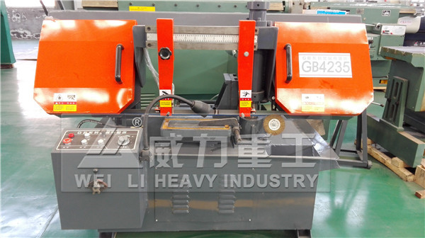 【產品描述】:GB4235臥式帶鋸床 主要特點: 切削速度液壓控制,無級調速; 導向塊結構科學合理,延長鋸條的使用壽命; 雙立柱結構,操作平穩; 鋸切穩定,精度高; 工作夾緊采用液壓夾緊,操作方便。 產品常用名稱: 鋸床,帶鋸床,臥式帶鋸床,金屬帶鋸床,雙柱式帶鋸床,GB4235帶鋸床 。 雙立柱臥式帶鋸床 是集機、電、液為一體的半自動帶鋸床,是鋸切較大直徑的黑色金屬和有色金屬